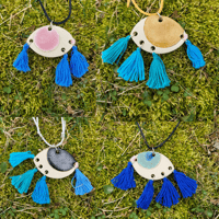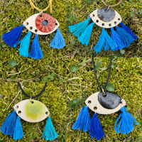 The crying eye has long been a symbol in art and art history; why not wear one on the artwork that is you! Each eye pendant is a mix of glazed and unglazed clay and comes with at least two tassels, velvet backing to preserve your clothing, and an adjustable silk cord so you can wear it at any length you like.